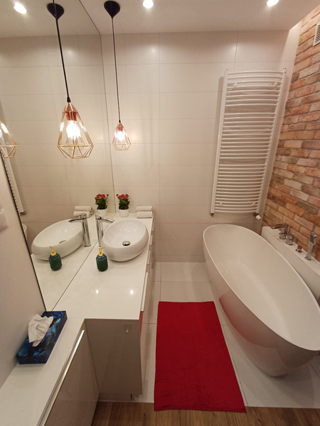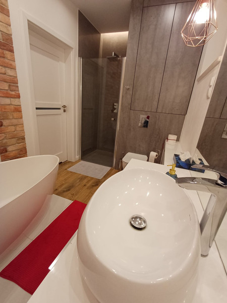 · Łazienka [7 m.kw.] z oknem. Mieści wolnostojącą wannę i kabinę prysznicową typu „Walk-In”, wbudowane szafki na kosmetyki, przybory łazienkowe i pojemnik na pranie. Ogrzewanie podłogowe plus kaloryfer.