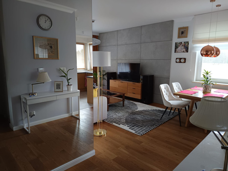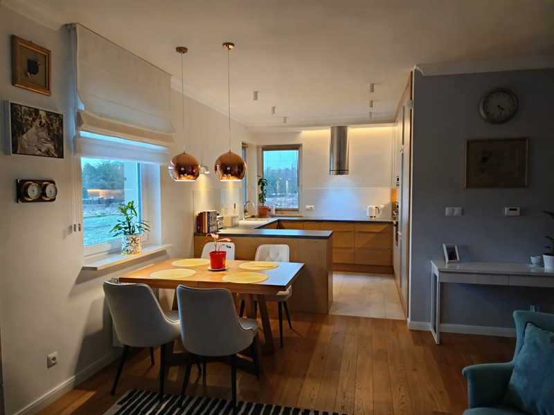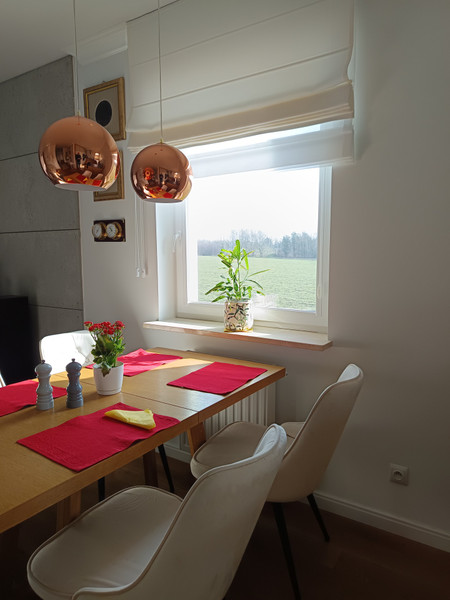 · Pokój dzienny z jadalnią [23 m.kw.] funkcjonalnie oddzielony zabudową kuchenną. Na podłodze deska barliniecka. Rodzinny rozkładany stół na 6 osób. Lampy nad stołem. Duża kanapa, stolik kawowy, stolik pod telewizor. Instalacja pod zawieszenie TV na ścianie. Widok z okna na pole i las.