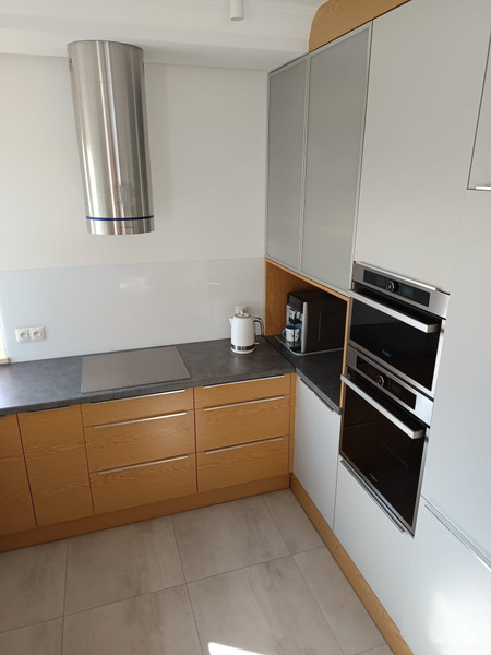 · Kuchnia na otwartym planie [9 m.kw.] z blatami roboczymi w kształcie litery „G”. Zlew - na wprost okna. W oknie siatka p. owadom. Zabudowa do sufitu sprawia, że mieszczą się w niej wszystkie sprzęty kuchenne; jest także miejsce na przechowywanie produktów. Płyta indukcyjna, okap, lodówka z zamrażarką, zmywarka uzupełniają wyposażenie. Ogrzewanie podłogowe.
