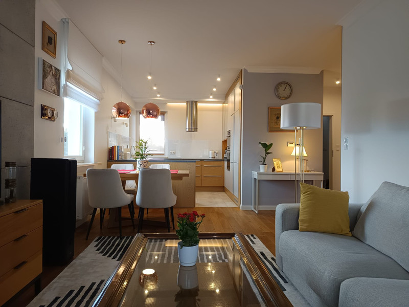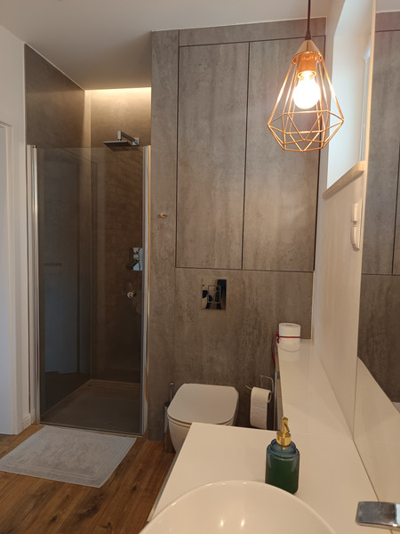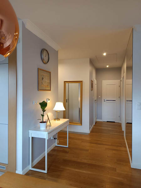 W mieszkaniu oświetlenie led’owe, punktowe, kinkietowe, z regulacją jasności w większości pomieszczeń. We wszystkich oknach żaluzje przeciwsłoneczne – w kuchni żaluzje drewniane.