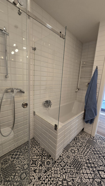 - przestronna łazienka wyposażona zarówno w wannę jak i kabinę prysznicową, wc, umywalkę estetycznie wkomponowaną w bardzo funkcjonalną podwieszaną szafkę z pojemnymi szufladami, jak również zabudowa meblowa z miejscem na pralkę oraz sporą przestrzenią na przechowywanie