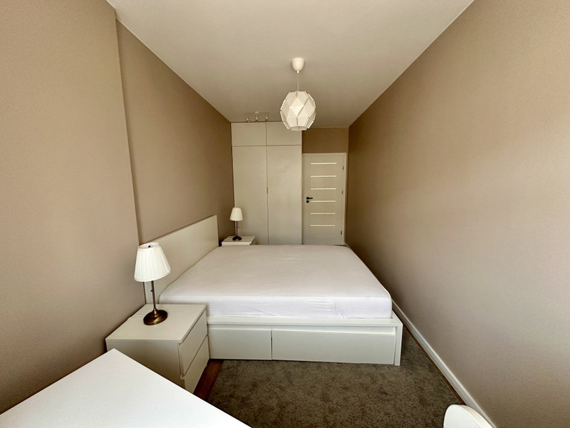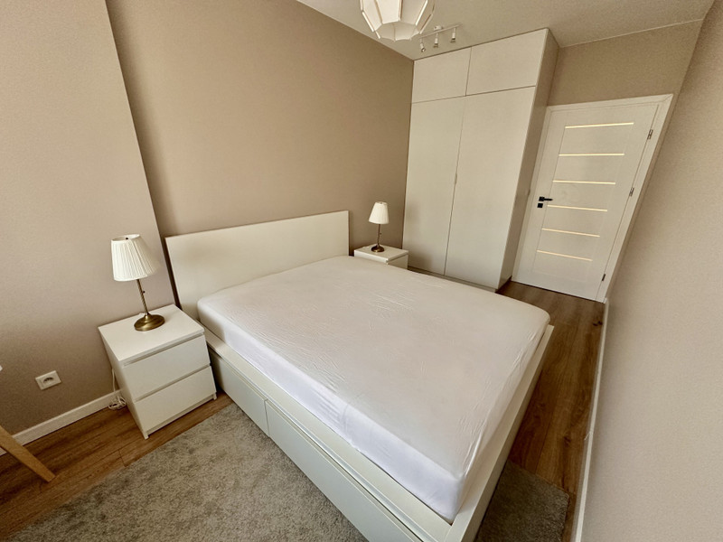 W mieszkaniu zostają także meble – łóżko z szafkami nocnymi, biurko, komody oraz szafki RTV. W sypialni i przedpokoju są duże szafy robione na wymiar przez stolarza.