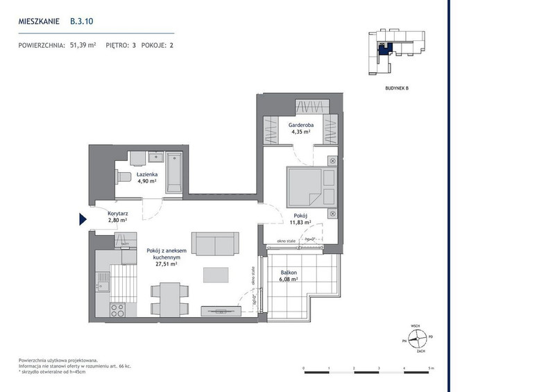 Lokal wyróżnia się funkcjonalnym układem pomieszczeń oraz dużą, otwartą strefą dzienną z aneksem kuchennym o powierzchni 27,51 m². Z salonu prowadzi wyjście na przestronny balkon o powierzchni 6,08 m², idealny do relaksu po pracy. Sypialnia o powierzchni 11,83 m² została zaprojektowana z myślą o komforcie, a jej dodatkowym atutem jest osobna garderoba (4,35 m²).