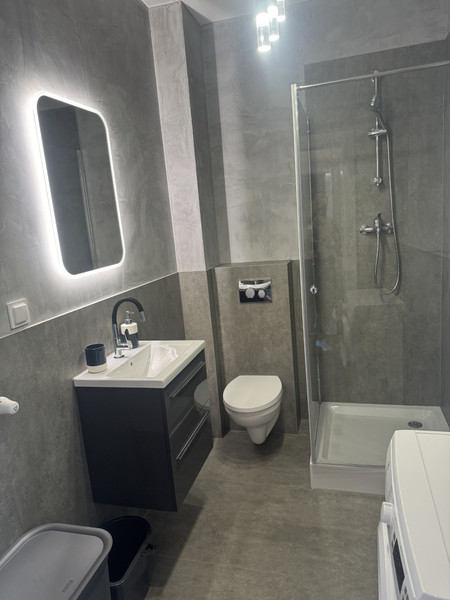 W łazience kabina natryskowa z deszczownicą, miska ustępowa podwieszana, umywalka w szafce, pralka oraz kosz na ubrania.