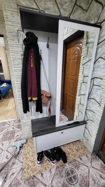 Przedpokój urządzony nowocześnie z miejscem do przechowywania.