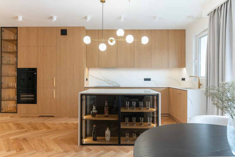 • Salon z aneksem kuchennym (30 m²) Przestronna strefa dzienna z designerską kuchnią z wyspą, dużym narożnikiem oraz stołem jadalnianym.