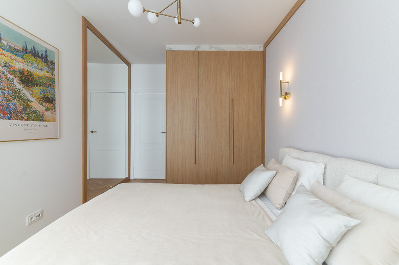 • Sypialnia główna (16 m²) z garderobą i tapicerowanym łóżkiem