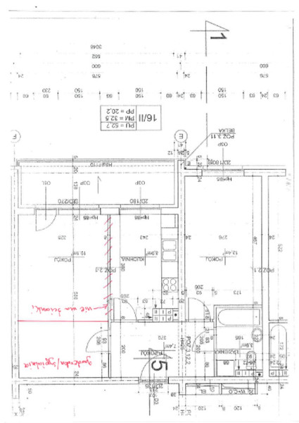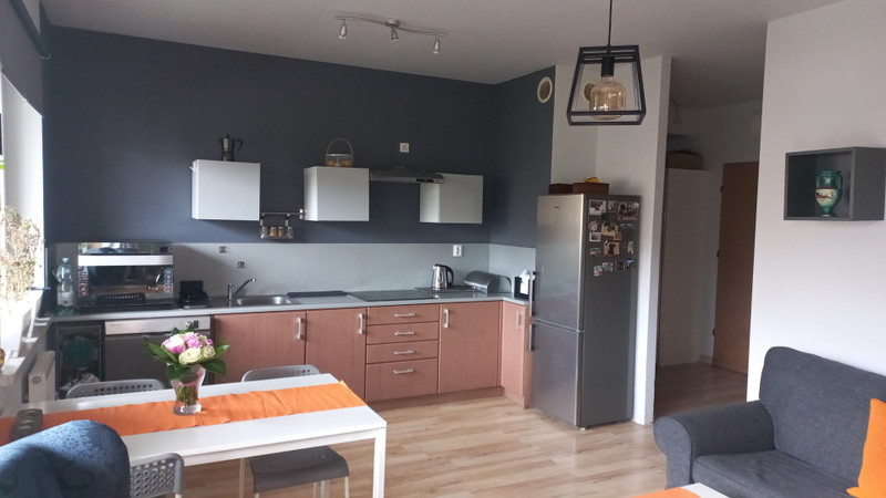 - pokoju dziennego z aneksem kuchennym 22 m² (jest możliwość przywrócenia pierwotnej wersji projektowej mieszkania, gdzie kuchnia jest oddzielna) wyposażonym w lodówko-zamrażarkę, płytę ceramiczną, piekarnik elektryczny;