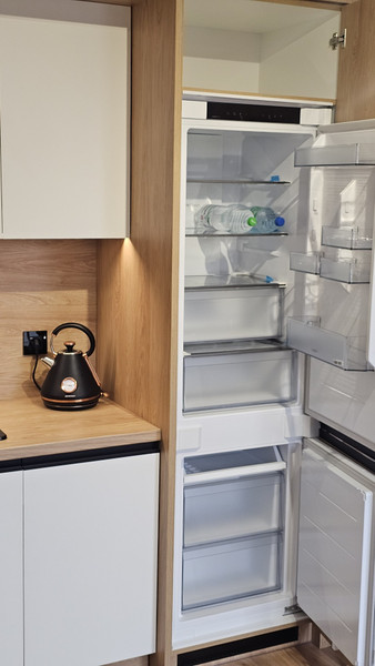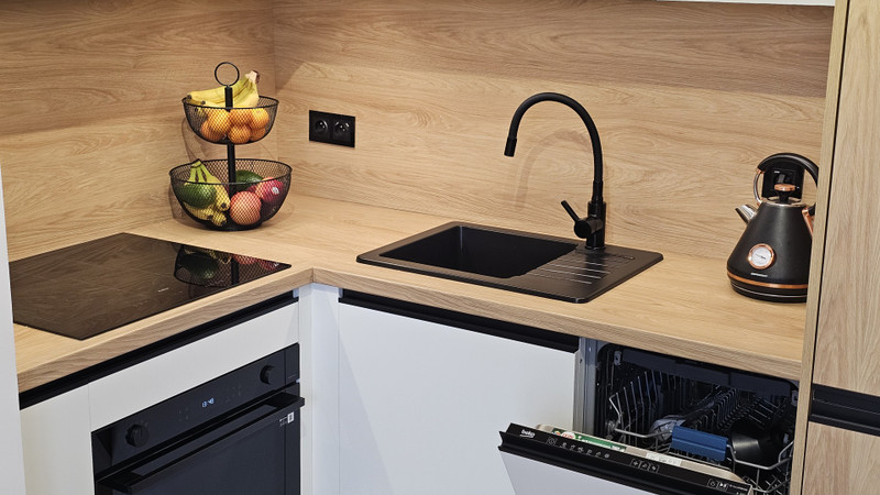 Kuchnię uzupełniają pojemne szuflady, szafka typu cargo, głębokie i wysokie pawlacze sięgające sufitu, zintegrowane oświetlenie LED oraz gniazdka wyposażone w porty USB i USB-C, umożliwiające ładowanie urządzeń bez użycia dodatkowych adapterów. Okap z filtrem węglowym skutecznie oczyszcza powietrze, zachowując estetykę zabudowy.