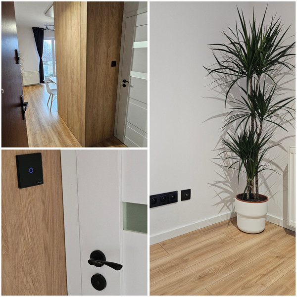 W przedpokoju zaprojektowano dużą szafę na wymiar z trzema praktycznymi szufladami. W górnej części wyprowadzono podwójne gniazdo 230V oraz światłowód, tworząc idealnie przygotowane miejsce pod router i sprzęt sieciowy. W całym mieszkaniu zastosowano szklane, dotykowe włączniki światła oraz eleganckie gniazdka z czarną, szklaną ramką, wyposażone w porty USB i USB-C.