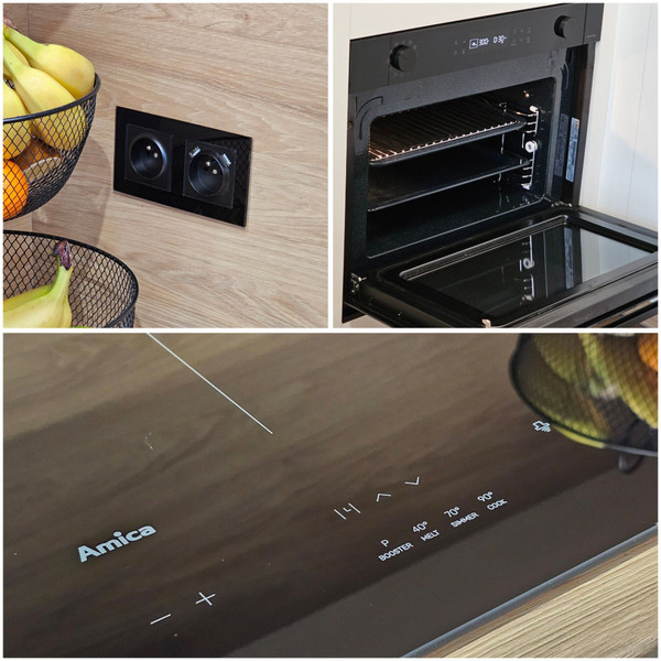Aneks kuchenny to pełnowartościowa, nowoczesna kuchnia, zaprojektowana z myślą zarówno o estetyce, jak i realnym użytkowaniu. Białe, matowe fronty bez uchwytów tworzą czystą, minimalistyczną linię, którą przełamuje dekor hikora na blacie i panelu ściennym. Płyta indukcyjna podpięta jest pod siłę i oferuje funkcję podtrzymywania temperatury, idealną do precyzyjnych zastosowań takich jak topienie czekolady czy utrzymywanie ciepła potraw bez ryzyka przypalenia. Piekarnik z funkcją mikrofali umożliwia szybkie podgrzewanie, rozmrażanie, klasyczne pieczenie oraz programy automatyczne, dzięki czemu zastępuje dwa urządzenia w jednym, oszczędzając miejsce i czas. Zmywarka zapewnia pełną wygodę codziennego użytkowania, a lodówka w zabudowie z systemem pełnego No Frost eliminuje konieczność rozmrażania, zapewnia równomierne chłodzenie i dłuższą świeżość produktów.