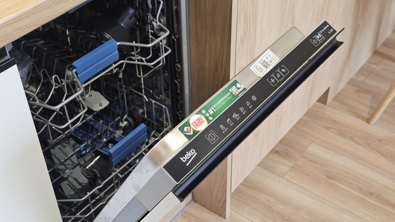 Całość wykończona została w podwyższonym standardzie, z wykorzystaniem mebli wykonywanych na wymiar. Zabudowy powstały w dekorze hikora, będącym wysokiej jakości wzorem drewna, który wizualnie ociepla wnętrze i nadaje mu elegancki, apartamentowy charakter, zachowując jednocześnie nowoczesną formę. Wszystkie systemy szuflad i zawiasów oparte są na rozwiązaniach Blum, co przekłada się na trwałość, cichy domyk i pracę oraz wysoki komfort codziennego użytkowania.