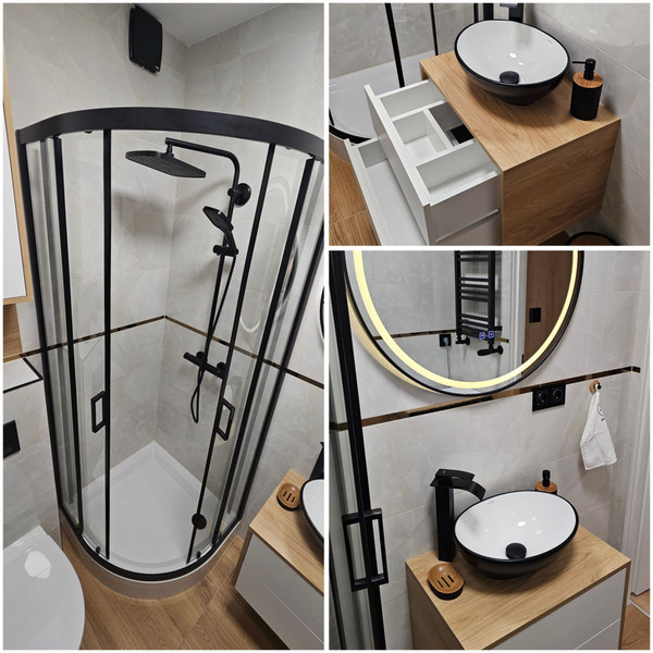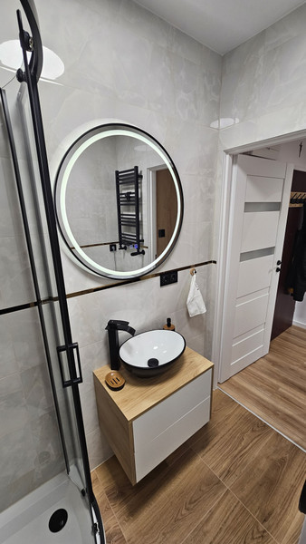 Łazienka to przestrzeń zaprojektowana w standardzie premium, z wyraźnym naciskiem na komfort i estetykę. Zaokrąglona szklana kabina prysznicowa została wyposażona w baterię termostatyczną, która utrzymuje stałą temperaturę wody, zwiększając wygodę i bezpieczeństwo użytkowania. Umywalka nablatowa posiada efektowną baterię wodospadową, stanowiącą elegancki akcent wizualny. Lustro LED z funkcją podgrzewania zapobiegającą parowaniu oferuje trzy barwy światła: ciepła, zimna, neutralna. Na wyposażeniu znajdziemy również nowoczesną pralkę z programami szybkiego prania, opóźnionym startem oraz czujnikami dostosowującymi zużycie wody i energii do załadunku.