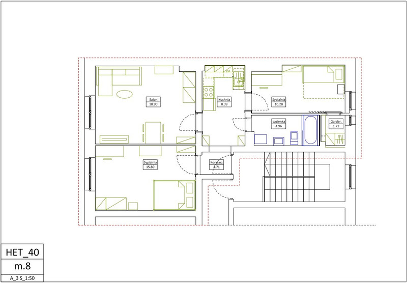 Lokal o powierzchni 62m² składa się z 3 niezależnych pokoi o powierzchni 18.9 m², 15.8m² i 10.28 m² z garderobą o pow. 1,72 m², kuchni i korytarza o powierzchni 10.1 m² oraz łazienki 4.96 m².