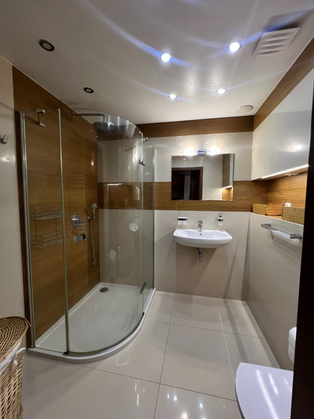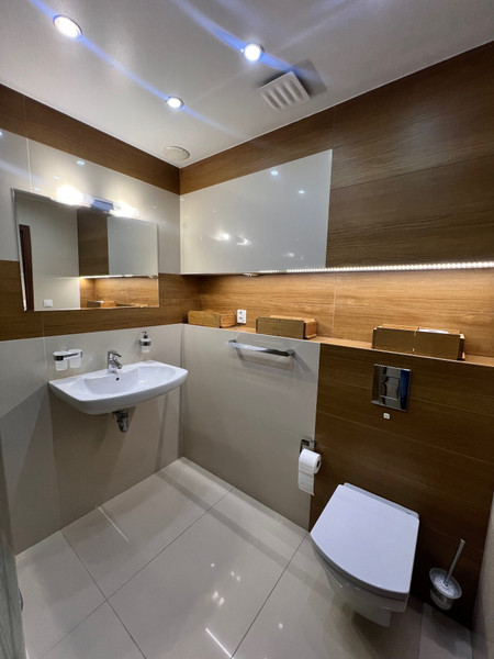 W łazience zamontowane są 3 niezależne systemy oświetlenia. Pierwszy o barwie ciepłej, a drugi o zimnej, która o poranku zdecydowanie szybciej pomoże nam się wybudzić i dodatkowo oświetlenie pod owym prysznicem, gdyby było niezbędne dla usprawnienia procesu naszej higieny.
