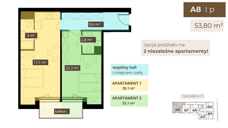 *Metraż: 53,81 m² | Piętro: 1 | ekspozycja zachodnia | możliwość podziału na 2 niezależne studia