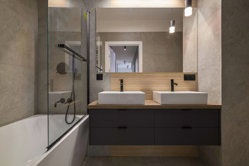 • Łazienka (4,53 m2) – wyposażona w wannę, prysznic i dwie umywalki