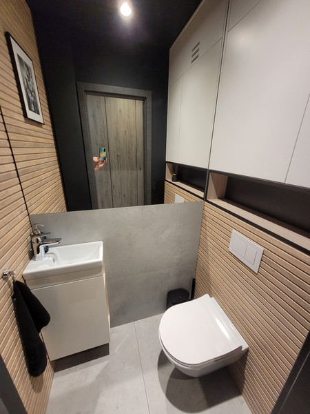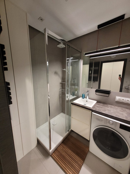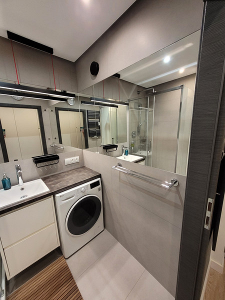 • łazienka i wc – szafy i szafki oraz lustra wykonane przez stolarza i szklarza na wymiar, kabina prysznicowa RADAWAY seria IDEA, baterie umywalkowe i prysznicowa (wraz z deszczownicą) HANSGROHE, bateria prysznicowa podtynkowa termostatyczna,