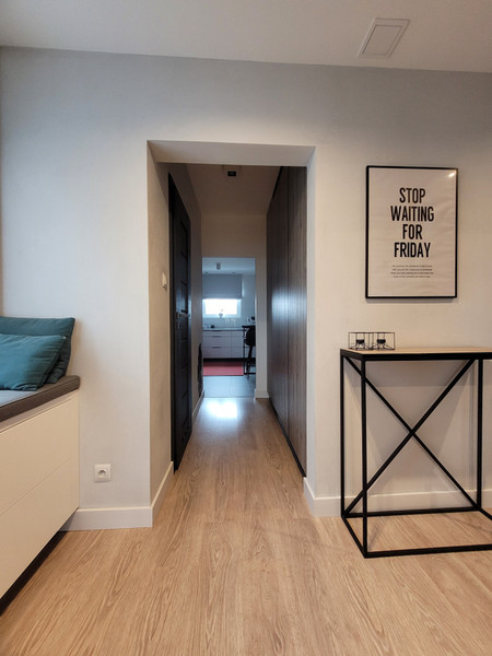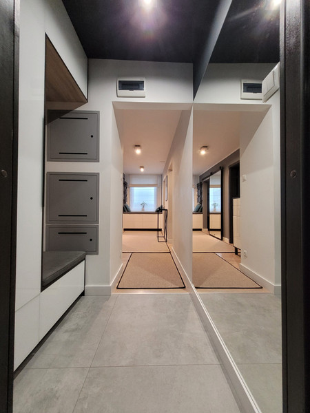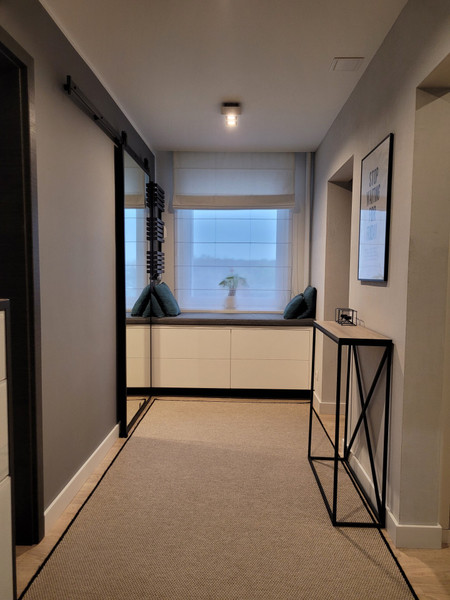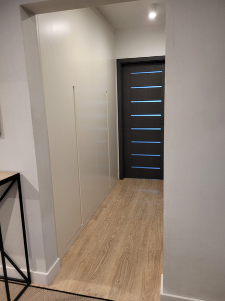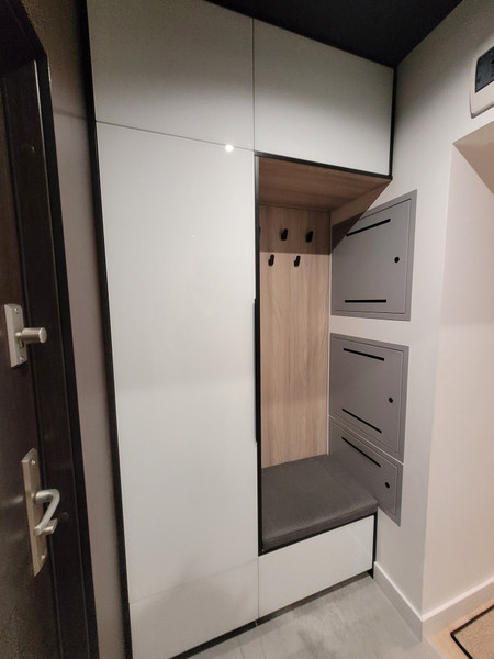 • korytarze – dwie szafy wysokie – każda wyposażona w oświetlenie wbudowane wewnętrzne uruchamiane poprzez otwarcie drzwi, szafka z siedziskiem pod oknem oraz szafka pod domofonem (fronty LACOBEL) wykonane przez stolarza na wymiar, poducha na siedzisku wykonana na zamówienie przez tapicera,