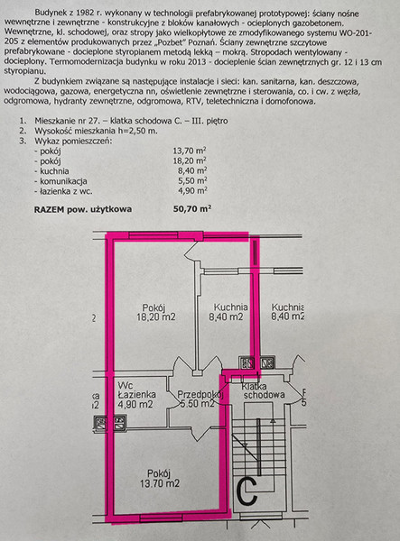 Mieszkanie składa się z dwóch pokoi, odrębnej kuchni, łazienki, przedpokoju oraz balkonu. Do mieszkania należy piwnica. Mieszkanie znajduje się na 3 piętrze czterokondygnacyjnego bloku. Okna wychodzą na dwie strony bloku (wschód-zachód), co powoduje, że jest bardzo jasne. W związku z tym, że nie jest to mieszkanie szczytowe, jest bardzo ciepłe.