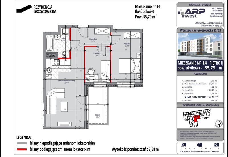 We are pleased to present a modern, bright three-room apartment with a total area of 55.78 m², featuring a 6.3 m² balcony, located on the 2nd floor of an intimate residential building completed in 2020, within the Rezydencja Groszowicka development in the Kamionek district of Warsaw.