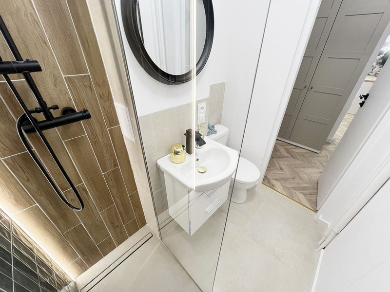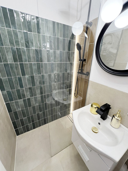 - ŁAZIENKA Z NOWOCZESNYM PRYSZNICEM Z ODPŁYWEM LINNIOWYM, DESZCZOWNICA.