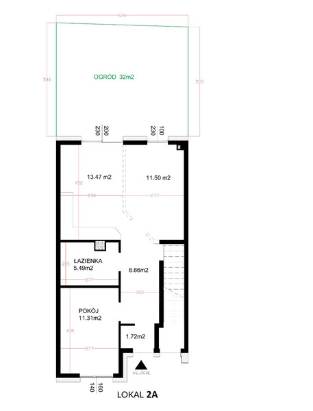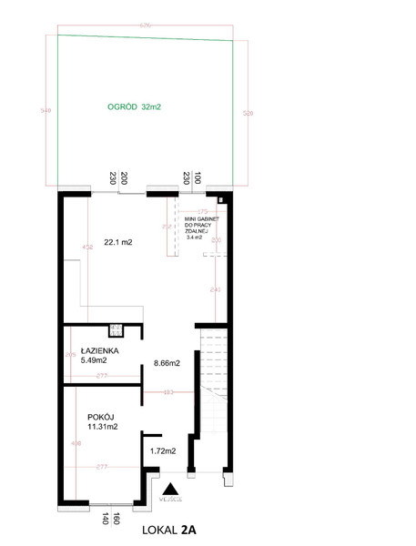 3-pokojowe mieszkanie na parterze z ogródkiem 32 m2 (nr 2A Ścianka wydzielająca trzeci pokój (z pełnowymiarowym oknem balkonowym) jest do wykonania jako zmiana lokatorska (dodatkowo płatna) zgodnie z wytycznymi nabywcy. Opcjonalna dodatkowa ścianka w kilku wariantach została oznaczona na rysunkach linią przerywaną.