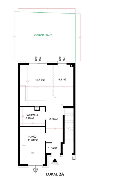 3-pokojowe mieszkanie na parterze z ogródkiem 32 m2 (nr 2A). Ścianka wydzielająca trzeci pokój (z pełnowymiarowym oknem balkonowym) jest do wykonania jako zmiana lokatorska (dodatkowo płatna) zgodnie z wytycznymi nabywcy.