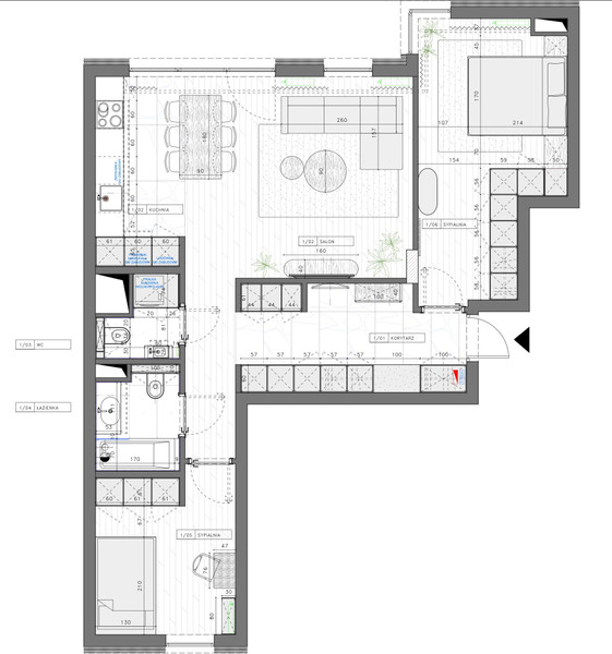 Rzut (który jest elementem projektu wykończenia wnętrza) tego nie pokazuje, ale mieszkanie oczywiście ma balkon, który dostępny jest z salonu/pokoju dziennego.