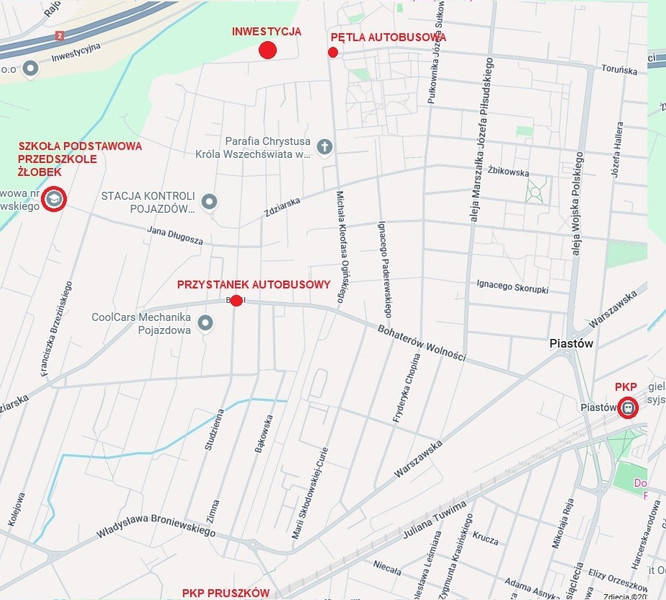 · Stacja PKP Piastów - 2,1 km (10 minut jazdy autobusem z Pętli Piastów-Ogińskiego)