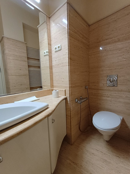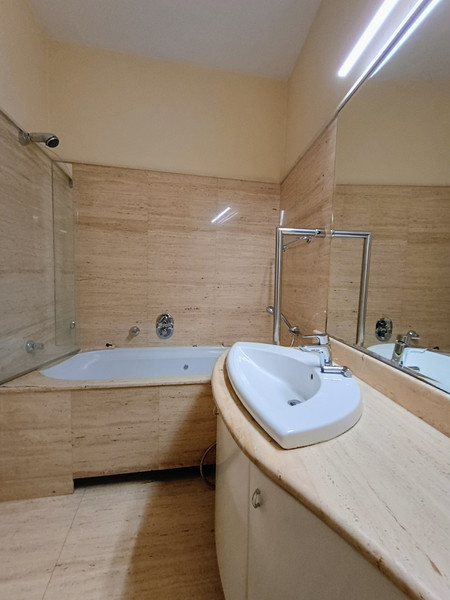 Trawertyn znajduje się również na ścianach w łazience oraz został użyty do obudowy wanny i jako blat pod umywalkę.