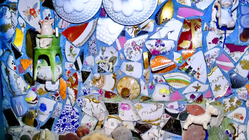 Łazienka-Wanna+Prysznic.Ściany wyłożone porcelaną z bibelotami.