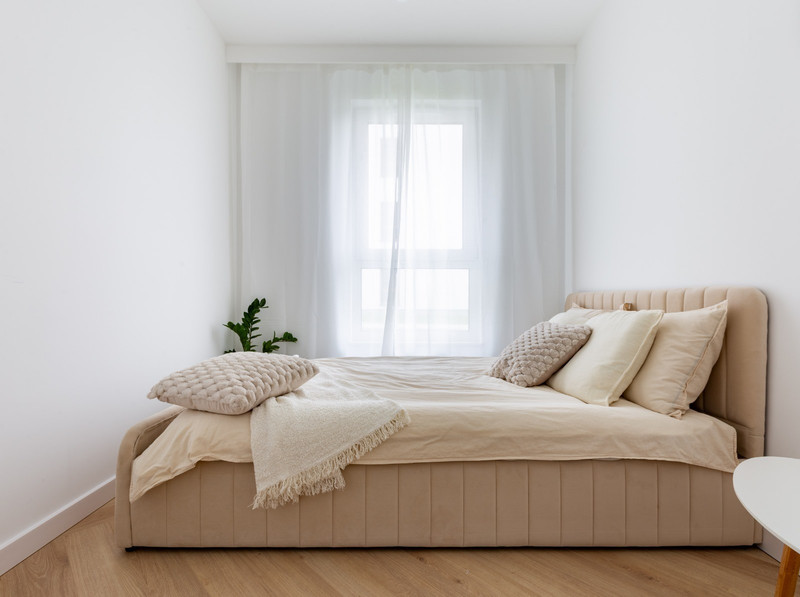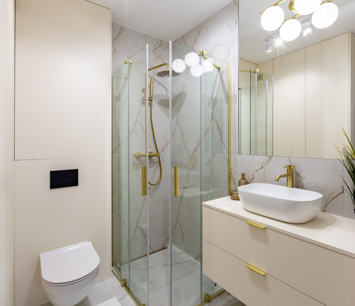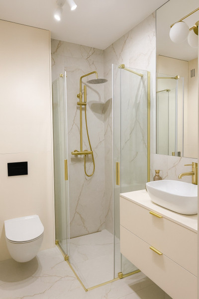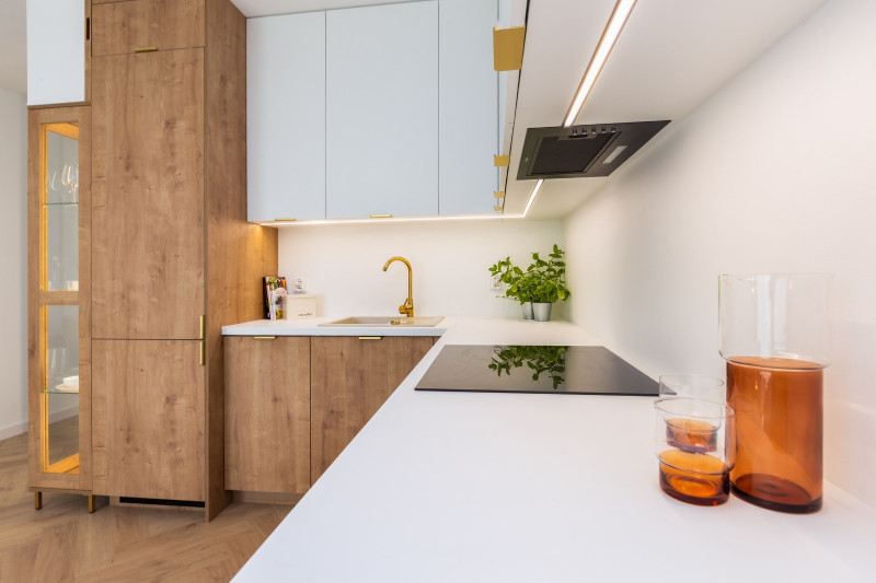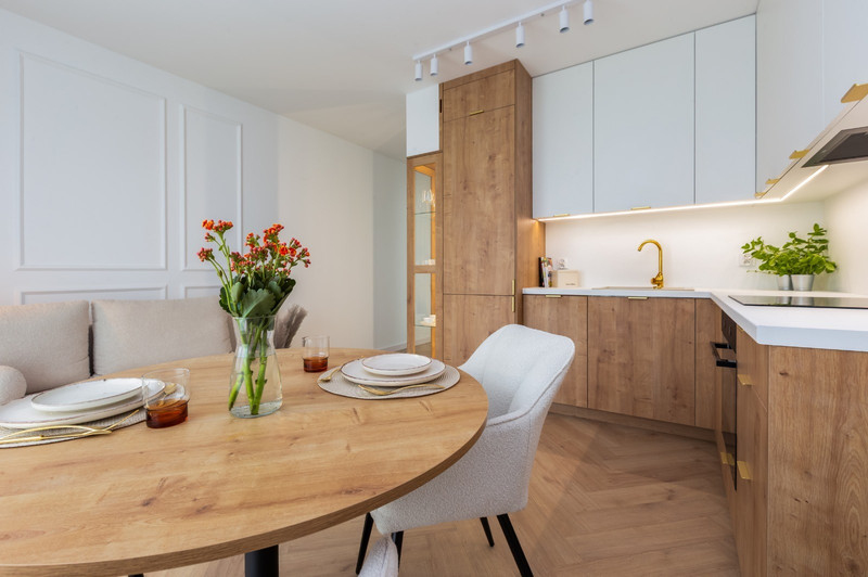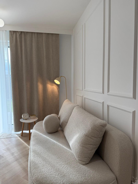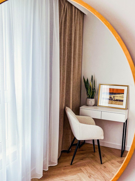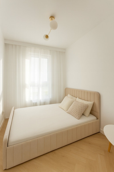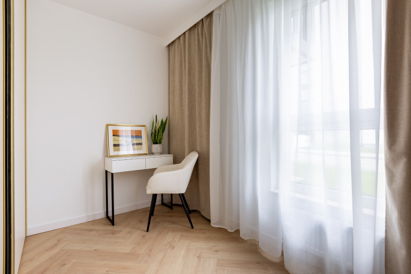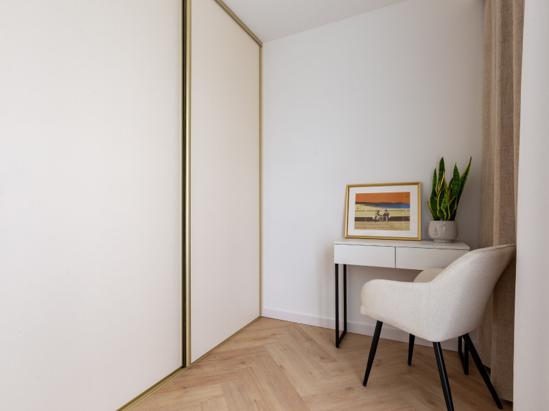 Nieruchomość składa się z dwóch oddzielnych pokoi, salonu z aneksem kuchennym, gustownej łazienki i przedpokoju. Funkcjonalny układ pozwolił uzyskać komfortową przestrzeń. Wnętrze zostało zaprojektowane z myślą o elegancji i spójności stylu, co widać w starannie dobranej kolorystyce. Dominuje tu szlachetna biel przełamana beżem i eleganckimi złotymi dodatkami, a całość dopełnia ponadczasowa podłoga ułożona we wzorze jodełki.