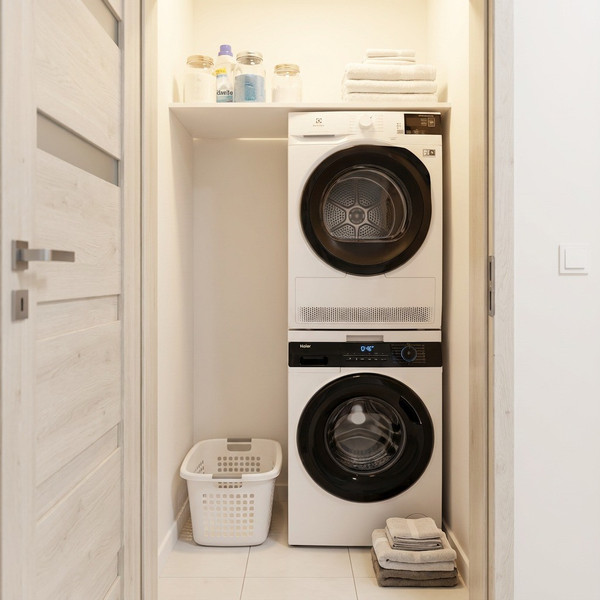 Praktyczny układ: 3 pokoje (salon + 2 sypialnie) oraz unikalne rozwiązanie – osobna pralnia/pomieszczenie gospodarcze wewnątrz mieszkania.