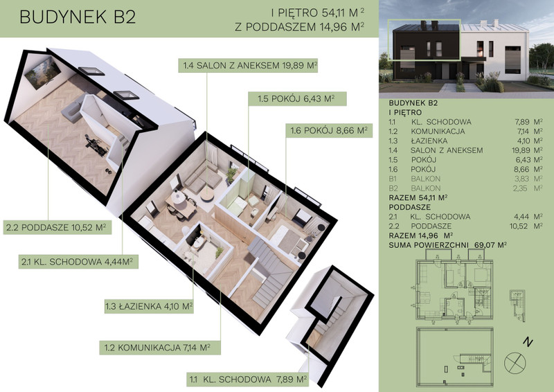 Oferta skierowana dla osób szukających mieszkania w kameralnym kompleksie z oryginalnym designem i nowoczesną architekturą. Osiedle zlokalizowane przy ul Św. Rocha 159a w Rzeszowie charakteryzuje się nie tylko wyjątkowym wyglądem, ale także praktycznością i wygodą oferowanych przestrzeni mieszkalnych. Priorytetem było dla nas stworzenie projektu funkcjonalnego i zapewniającego przyszłym mieszkańcom maksymalny komfort użytkowania. Charakterystyczną cechą mieszkań jest przestronna część dzienna z dużymi, nowoczesnymi oknami. Standardem jest ogrzewanie podłogowe oraz instalacja klimatyzacji. Każde mieszkanie dysponuje balkonem lub ogródkiem, co jest dużym walorem dla osób ceniących bliskość natury i prywatną przestrzeń na świeżym powietrzu. Dla entuzjastów aktywnego spędzania czasu, bezpośrednio przy osiedlu znajduje się szlak turystyczny prowadzący do kompleksu leśnego przy ul. Św. Marcina z licznymi ścieżkami umożliwiającymi rekreację na świeżym powietrzu. W odległości jednego kilometra od osiedla znajduje się Szkoła Podstawowa nr 5, w pobliżu usytuowane są również przedszkola, żłobek, sklep spożywczy, przystanek komunikacji miejskiej. Oferowane lokale mieszkalne wyróżniają się wyjątkowym komfortem akustycznym ze względu na zastosowanie podwójnych wygłuszonych niezależnych ścian nośnych o łącznej grubości 50 cm oddzielających od siebie każde z mieszkań. Oferowany lokal mieszkalny o powierzchni 54,11 m² usytuowany jest na pierwszym piętrze i posiada trzy pokoje, aneks kuchenny, łazienkę oraz dodatkowo poddasze. Każde mieszkanie wyposażone jest w dwa indywidualne miejsca postojowe dla samochodów. Cena dotyczy wykończonego mieszkania na pierwszym piętrze do stanu deweloperskiego z miejscami postojowymi i udziałem w drodze dojazdowej. Oferujemy możliwość wykończenia do stany deweloperskiego poddasza, dopłata wynosi 20 tyś, zł. W tej cenie oferujemy montaż dwóch okien dachowych, docieplenie poddasza wełna mineralną i zabudowę płytą GK, wykonanie tynków oraz montaż dwóch grzejników. Poza tym nie ma innych dodatkowych dopłat poza kosztami notarialnymi.