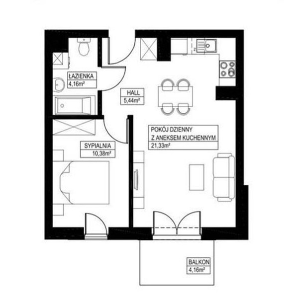 - 2 pokoje: salon z aneksem kuchennym (21,3 m2) oraz sypialnia (10,5 m2)