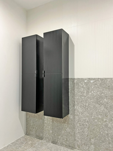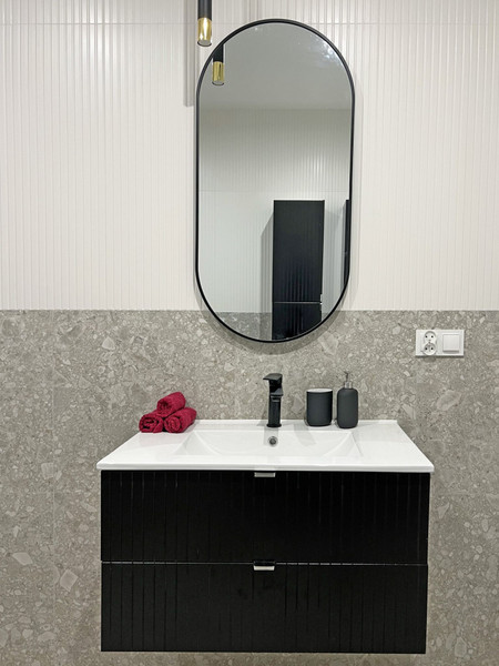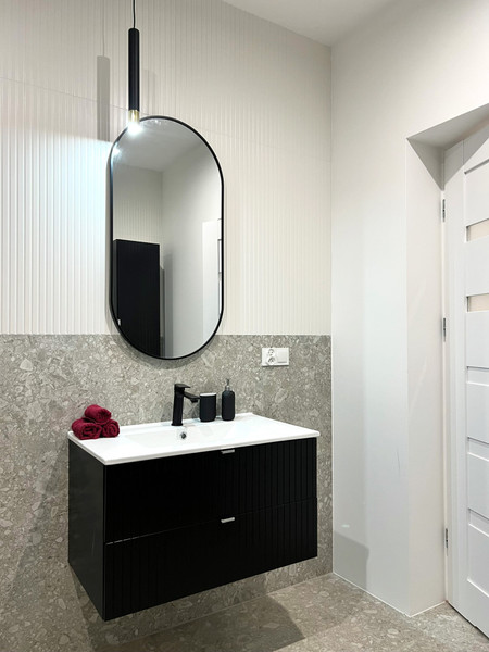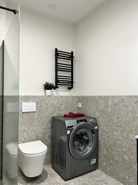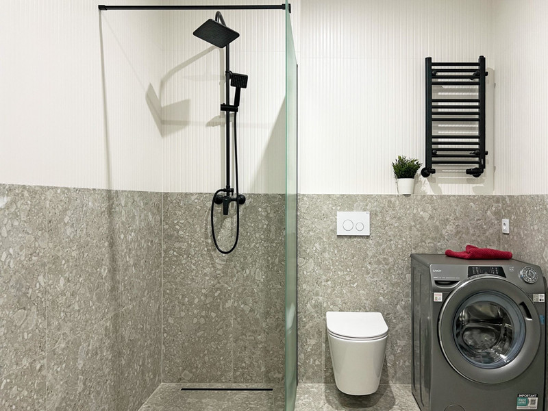 - Łazienka z prysznicem typu walk - in - bez brodzika, z czarnymi akcentami i elegancką armaturą oraz nową pralką na gwarancji.
