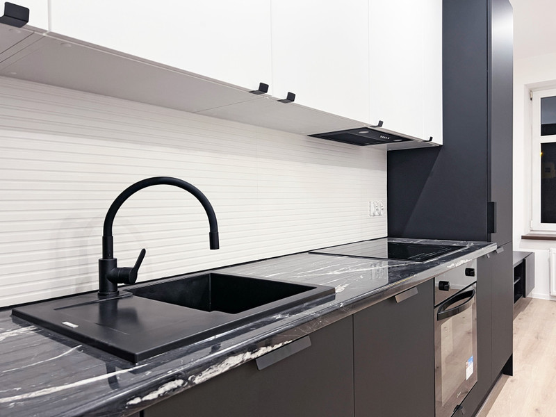 - Nowoczesna kuchnia w czerni i bieli - nowy sprzęt AGD na gwarancji: piekarnik, płyta indukcyjna, okap, lodówka, zamrażarka, zmywarka.