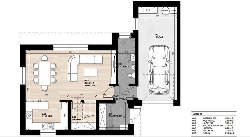 • Garaż z wyjściem na ogród – 26,06 m²
