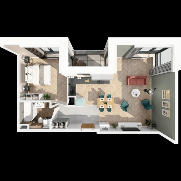 • Przestronny salon z aneksem kuchennym – 34 m2