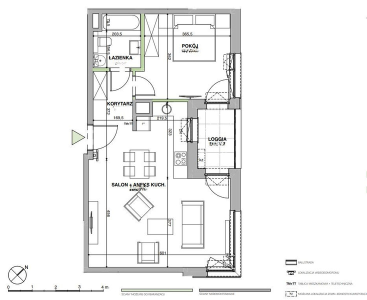 • Przestronny salon z aneksem kuchennym – 34 m2