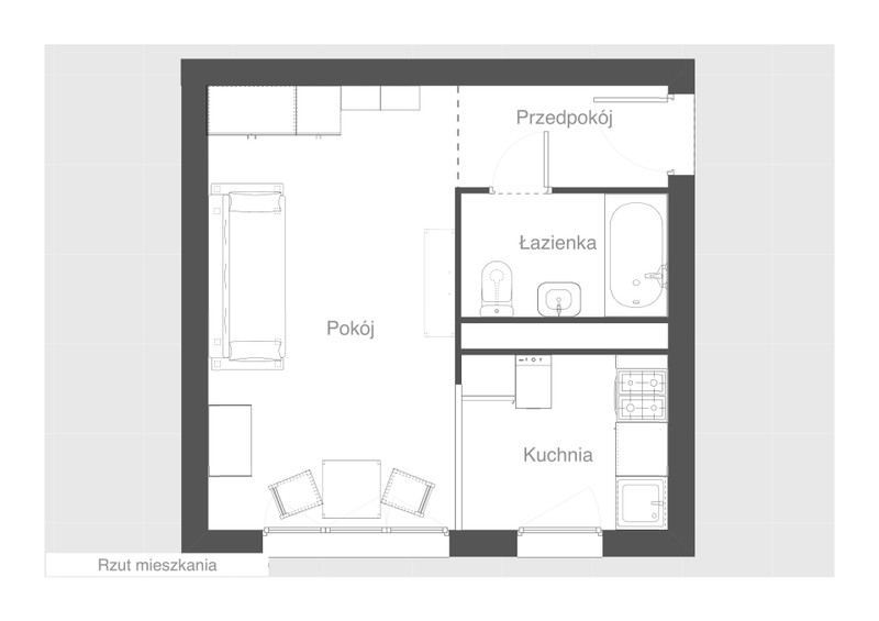 Układ pomieszczeń: pokój, przedpokój, oddzielna kuchnia oraz łazienka z toaletą (zgodnie z rzutem).