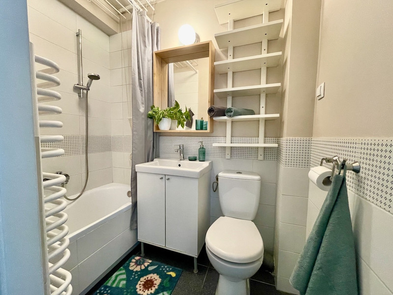 W łazience znajduje się wanna i WC, a w przedpokoju – praktyczne szafki i lustro.