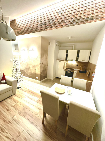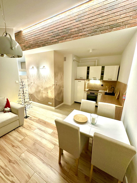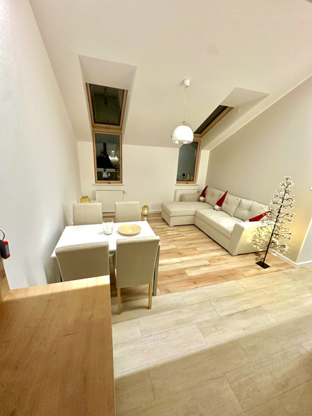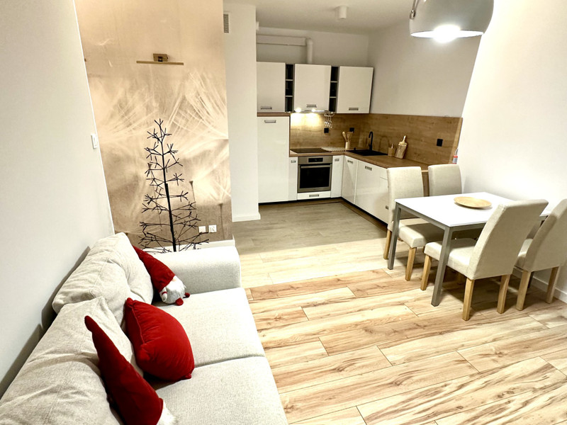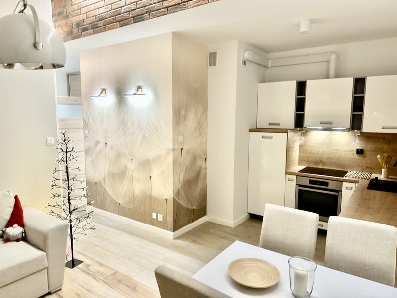 Przestronny i jasny, z pełnym wyposażeniem kuchni: zmywarka, lodówka, płyta indukcyjna.