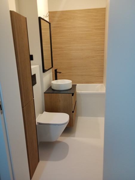W łazience płyty gresowe 120x60 wysokiej jakości , wanna, WC umywalka oraz meble.