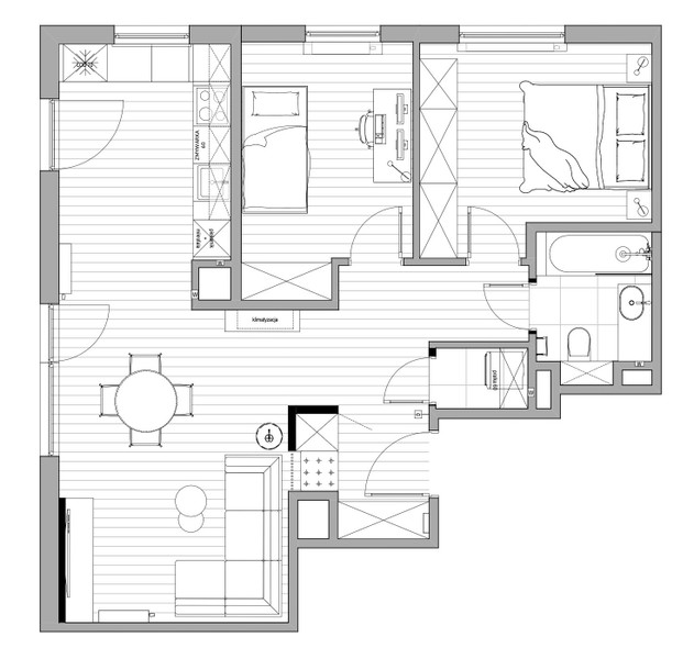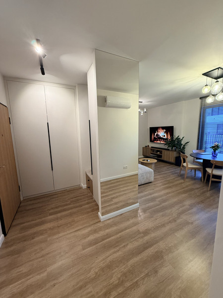 Mieszkanie zostało wykończone rok temu w wysokim standardzie i jest w pełni wyposażone - gotowe do zamieszkania. Układ jest bardzo funkcjonalny: dwa niezależne pokoje (sypialnia i biuro), przestronna kuchnia połączona z salonem, łazienka (wanna z prysznicem) oraz praktyczne pomieszczenie gospodarcze. Dzięki ekspozycji zachodniej i północnej wnętrza są jasne, a jednocześnie nie przegrzewają się latem. Dodatkowo mieszkanie wyposażone jest w klimatyzację.