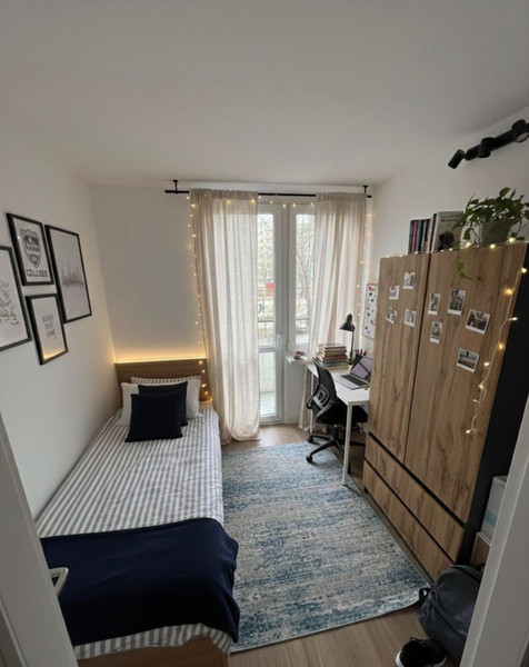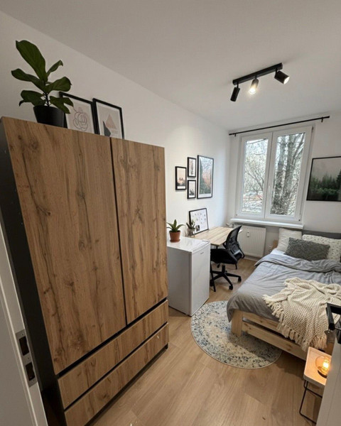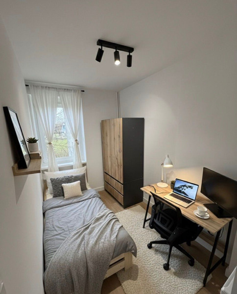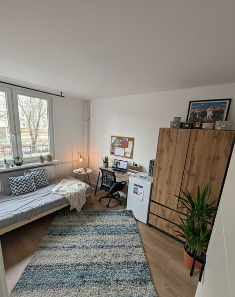 Każdy pokój jest zamykany na klucz i wyposażony w osobną lodówkę, co zapewnia najemcom większą prywatność i komfort użytkowania. Dodatkowo w skład mieszkania wchodzą szafy w każdym z pokoi lampki nocne, biurka oraz fotele.