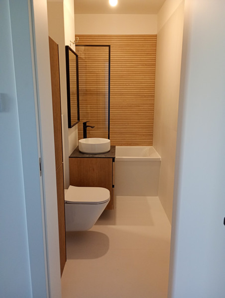 W łazience płyty gresowe 120x60 wysokiej jakości , wanna, WC umywalka oraz meble.