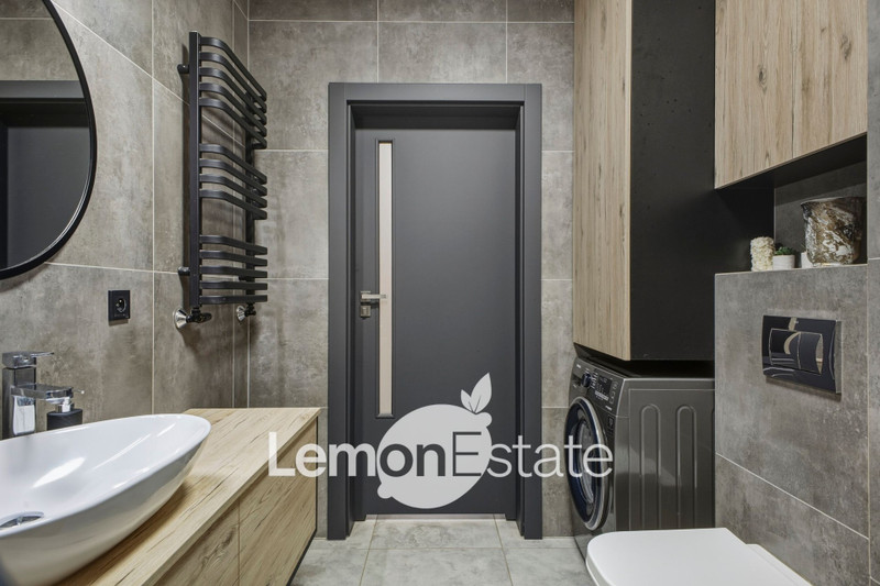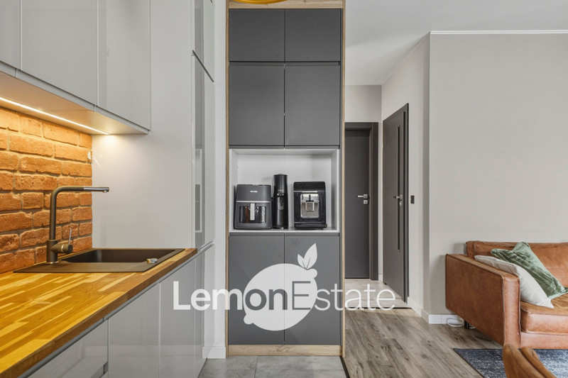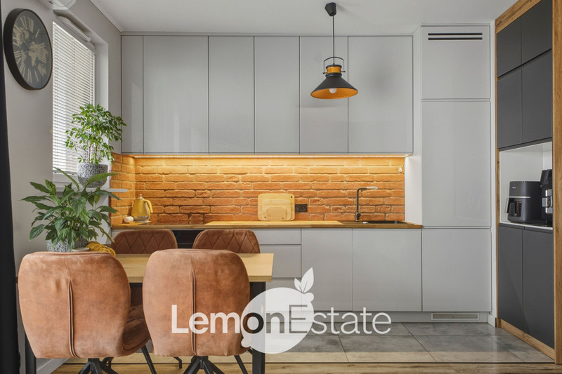 • Kuchnia – zabudowa wykonana na wymiar, fronty lakierowane w kolorze szarym, sprzęty AGD w zabudowie (lodówka, płyta, piekarnik). Dodatkowe drewniane elementy w kolorze dąb wotan. Na ścianie między blatem a szafkami dekoracyjna cegła, na podłodze gres.