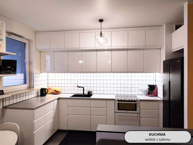 • Kuchnia – funkcjonalny rozkład zabudowy, dużo szafek, blat roboczy przy którym swobodnie mogą gotować dwie osoby
